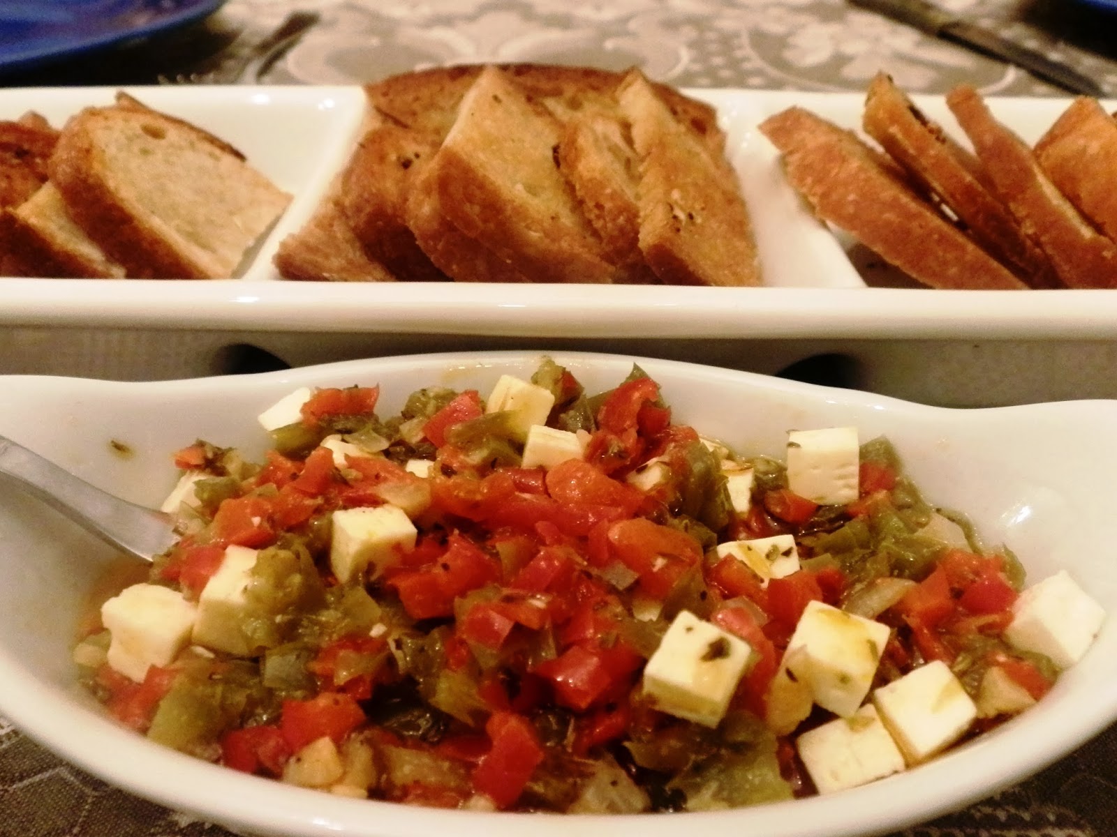 Corta-se queijo feta em quadradinhos pequenos e junta-se à mistura dos pimentos.